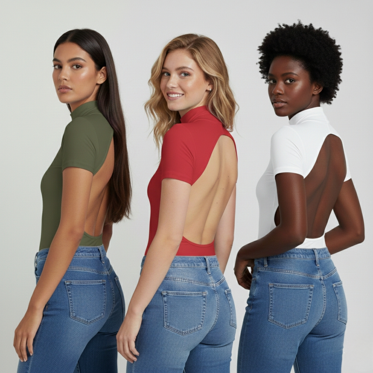 Produto: BODY FEMININO MANGA CURTA E GOLA ALTA – COSTAS ABERTAS
